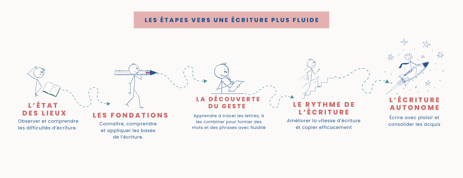 Vous suivez un parcours en 5 étapes, structuré et progressif, pour accompagner votre enfant du repérage des difficultés à une écriture plus lisible et rapide.